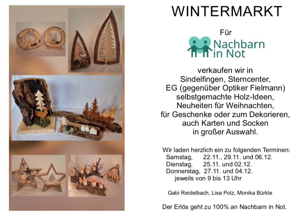 Wir verkaufen im Sterncenter Sindelfingen selbstgemacht Holz-Ideen, Neuheiten für Weihnachten, für Geschenke oder zum Dekorieren, auch karten und Socken in großer Auswahl.